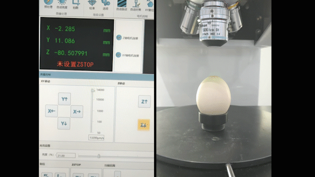 在镜头的上方安装有机械防撞传感器,当镜头向下位移与样品表面直接接触时,触发感应器,镜头与样品表面变为软接触,并触发紧急停止开关,不再响应向下位移的指令,有效的避免镜头和样品的损伤,如以下动图所示: