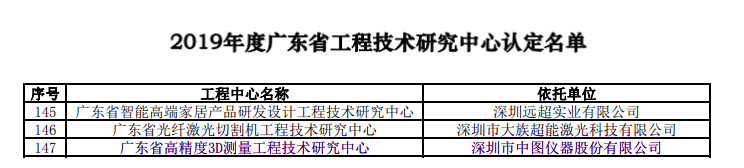 有限公司申报的“广东省高精度3D测量工程技术研究中心”,被正式认定为2019年度广东省工程技术研究中心。
