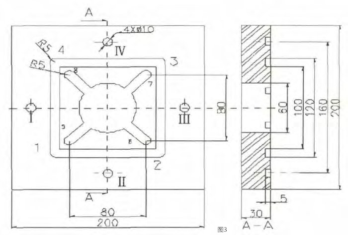 综合考虑各种因素,本次三轴数控铣床的几何误差的设备使用中图蓝颜gtv SJ6000 激光干涉仪采用直接测量法。试验零 件如图3所示,具体毛坯参数:200mm×200mm×30mm,铝。零件加工中的具体参数为 :直柄键槽铣刀 Φ10mm,三轴数控铣床主轴转速 1000 r/min,切削进给速度为 80 mm/min。在 进行零件加工的时候,为了最大限度地降低切削力误差造成影响,前后两次零件的试切均选择小切削量低速进给的加工方法。