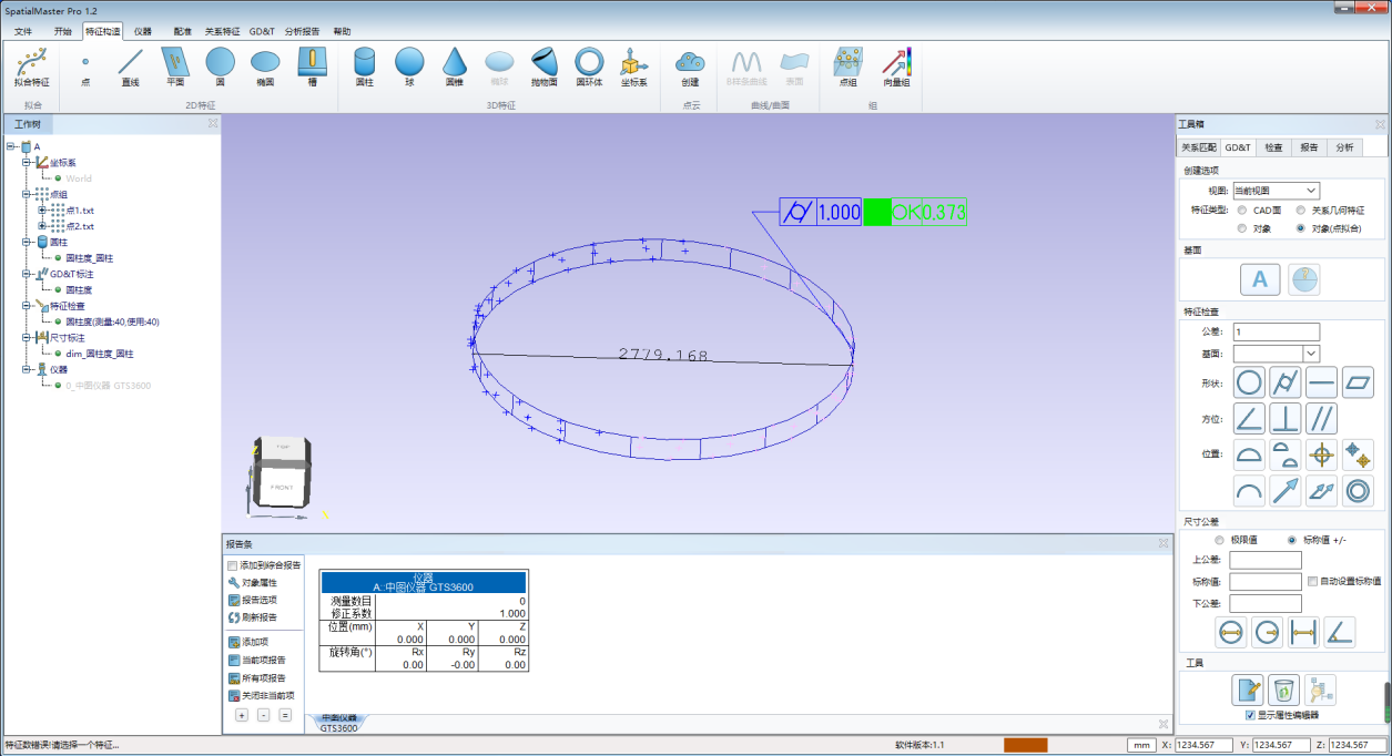 在测量现场,将激光跟踪仪安装在法兰盘周边合适位置,用靶球在法兰盘面上采集若干点,软件再将所测量的点拟合成圆柱,然后分析圆柱的直径及圆柱度。