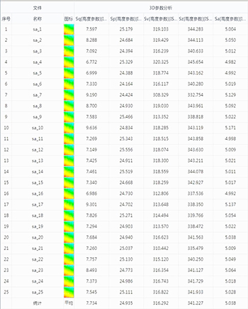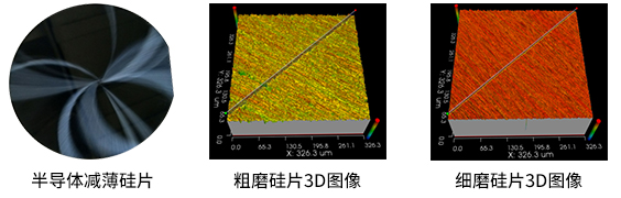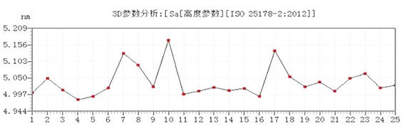 Wafer减薄工序中粗磨和细磨后的硅片表面3D图像,用表面粗糙度Sa数值大小及多次测量数值的稳定性来反馈加工质量。在生产车间强噪声环境中测量的减薄硅片,细磨硅片粗糙度集中在5nm附近,以25次测量数据计算重复性为0.046987nm,测量稳定性良好。 |