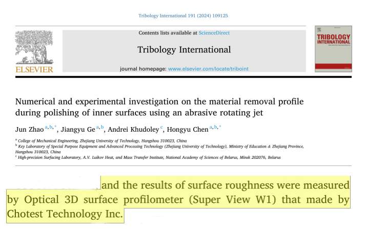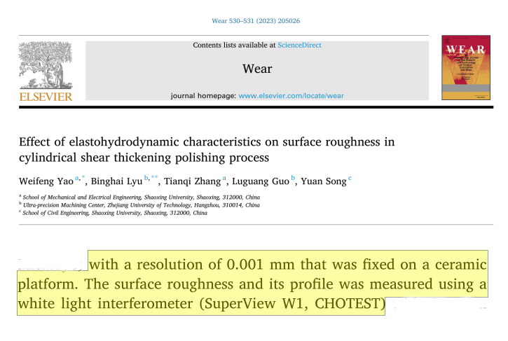 浙江工业大学赵军、吕冰海团队对磨料旋转射流抛光(ARJP)技术,剪切增稠抛光技术等开展深入研究,并利用SuperView W1系列光学3D表面轮廓仪对抛光后表面粗糙度进行检测验证,多篇论文在国际TOP期刊发布。