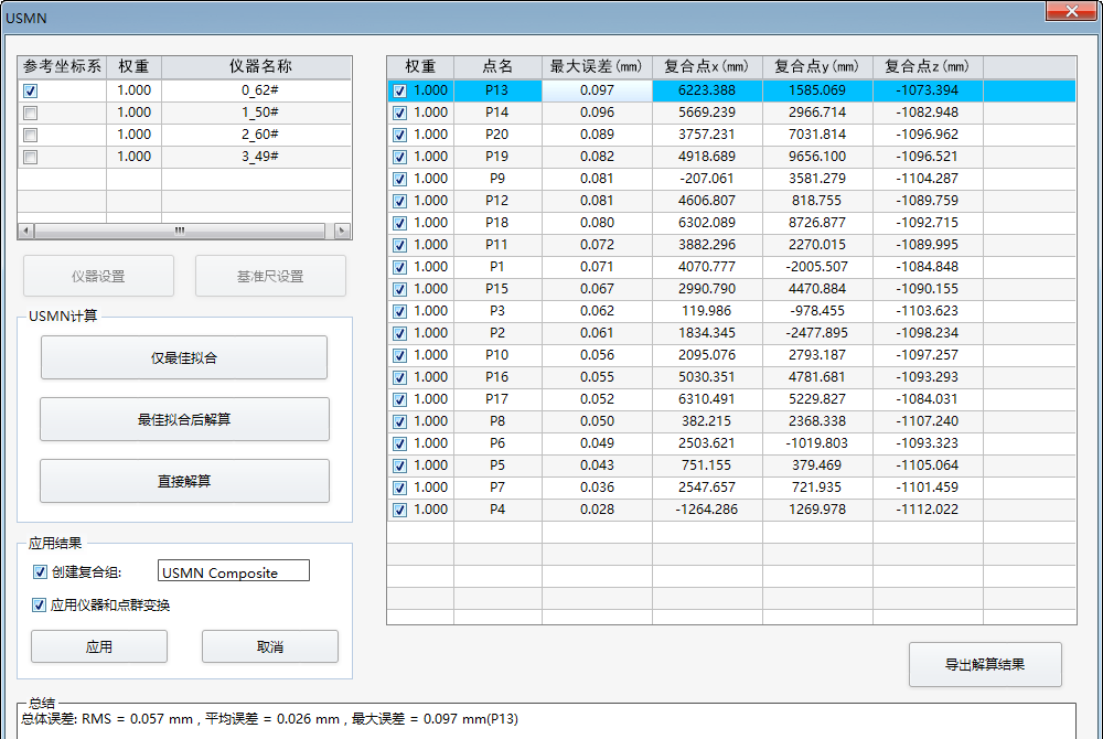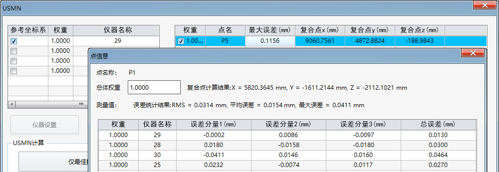 同时可以利用USMN 的数据统计功能(图4)帮助测量分析者判断结果的可靠性,在多站位拟合时,也可及时发现某一站位的测量点中粗大误差,及时剔除防止干扰后续测量的准确性。