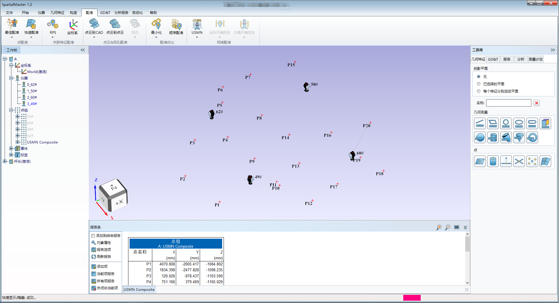 如何在大范围空间测量中,突破单站激光跟踪仪精度限制,实现更高精度的测量呢?为了解决这一问题,中图蓝颜gtv 推出的激光跟踪仪测量分析软件SpatialMaster(SMT软件)集成了USMN功能。USMN 技术是一种由多测量设备构建的空间坐标测量网,它通过足够数量的固定参考点将多个测量设备联系起来并统一在一个坐标系下。USMN采用最优化数值计算技术,利用多测站权重分配优化平差,可以显著减小角度测量误差对测量结果的干扰,充分利用激光跟踪仪测距精度高的特点。