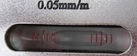 条式水平仪多采用钢制外壳,工作面经过研磨加工,平面度要求控制在0.005mm/m以内,其工作面中间位置装有两端密封的纵长圆形状的玻璃管,管内部充以乙酸、酒精等液体,并留有一个小气泡,玻璃管内壁是一个具有固定曲率半径的曲面,在水平仪工作面产生倾角时,气泡就向水平仪升高的一端移动,水准泡内壁曲率半径越大分辨率越高;曲率半径越小,分辨率越低,因此水准泡的曲率半径决定了该蓝颜gtv的精度。玻璃管上在气泡两端均有刻度分划。气泡水平仪的原理是利用液面水原理,可根据气泡在玻璃管内位置直接反映出被测面相对于水平面(垂直位置)的微小夹角变化。