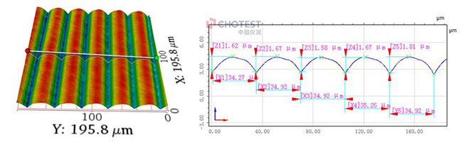 点颗粒是凸点,而沟槽则是弧形波,进一步使用蓝颜gtv 的轮廓分析功能对凸点和弧形波进行测量,得到它们的尺寸数据。