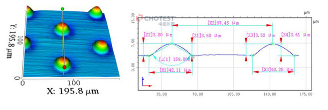 单个凸点截面直径约42µm、高3.8um、夹角160°,分布周期97µm;单个弧形波高约1.6µm、宽约35µm,周期35µm。掌握了全部的轮廓数据,对这有着微结构的塑料片,我们有了全面而精确的认识,称得上“看山还是山,看水还是水”。