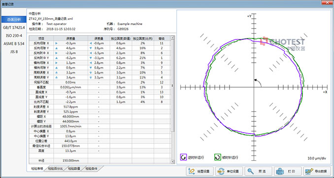 全面的诊断报告具有强大的诊断功能,能为您提供机器性能的全面和专业的评估。以XY平面360度测量为例可评估:反向间隙 X、反向间隙 Y、反向跃冲 X、反向跃冲 Y、横向间隙 X、横向间隙 Y、周期误差 X、周期误差 Y、伺服不匹配、垂直度、直线度 X、直线度 Y、比例不匹配、刻度误差 X、刻度误差 Y、螺距 X、螺距 Y、进给率、中心偏置 X、中心偏置 Y、位置公差、最佳拟合半径、圆度。