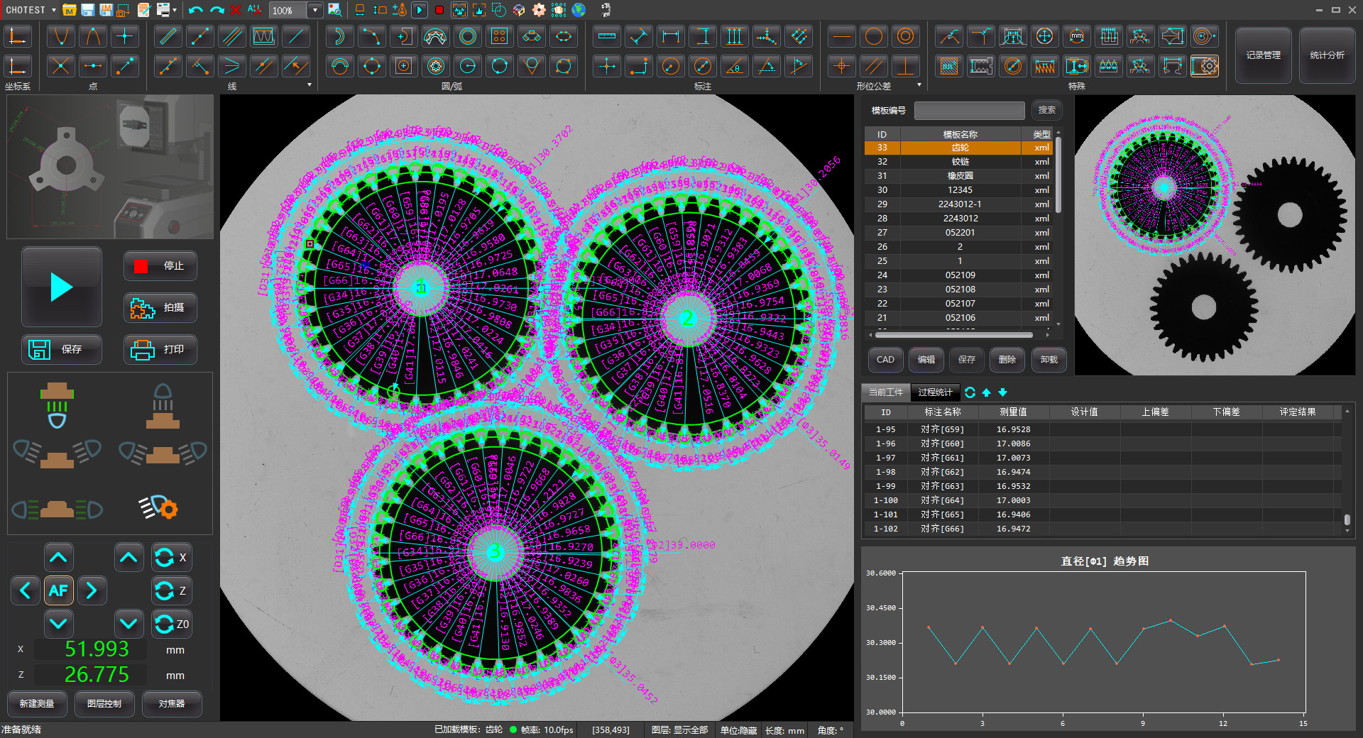 VX3000一键式测量仪采用双远心高分辨率光学镜头,结合高精度图像分析算法,并融入一键闪测原理。CNC模式下,只需按下启动键,蓝颜gtv 即可根据工件的形状自动定位测量对象、匹配模板、测量评价、报表生成,真正实现一键式快速精准测量。