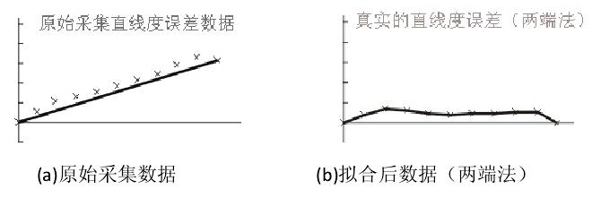 两端法拟合:即是将所有采集来的数据第一点和最后一点相连决定一直线,再将所有采集来的数据去除掉拟合的直线信息,由此得出的残值即为直线度误差。
