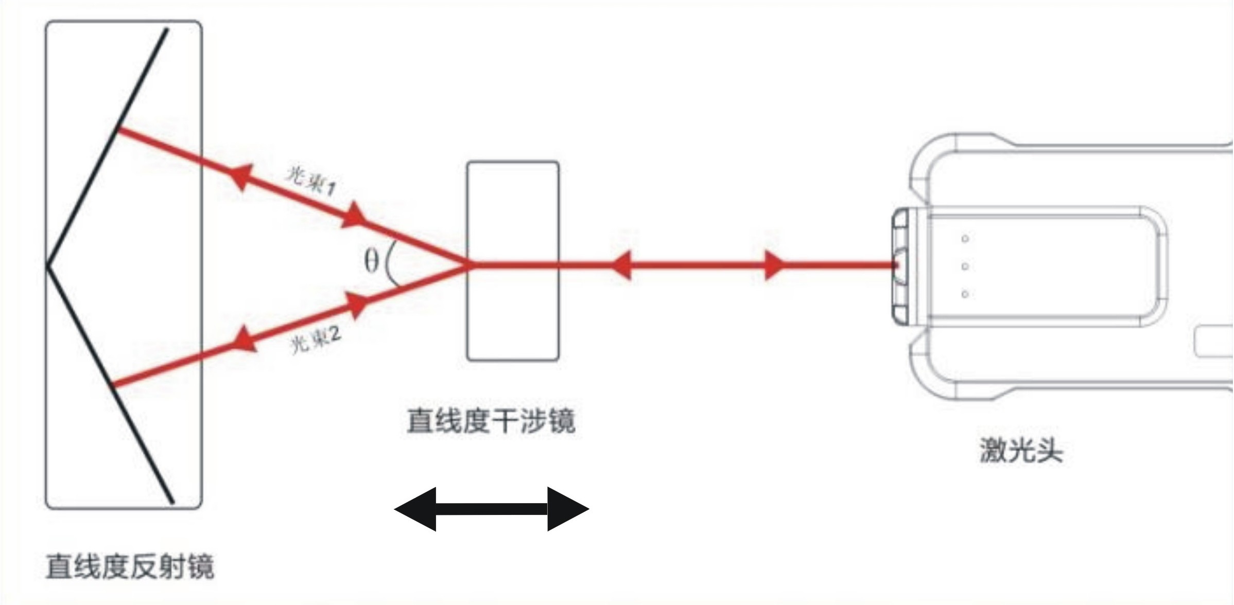 原理:带有圆孔的是直线度干涉镜,其与待测轴相连一同运动;长条镜是直线度反射镜静止安装,其是对称结构,上下左右均对称。当一束激光从源头发出射入干涉镜,干涉镜将光束分成两束,形成一个很小的角度分别去往反射镜,由于反射镜上下对称,因此两束光被反射后又回到干涉镜,汇合成一股光束,去往激光头的探测器。当运动轴产生直线度误差时,会使得干涉镜相对于反射镜在水平横向方向发生相对运动,而反射镜是左右对称的(左右的镜片不在同一平面,有一定的角度),因此会使得两束分开的光束光程具有差别,根据此差别,即可测得运动轴产生的直线度误差。