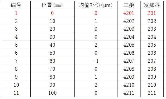 以坐标系0-100mm,间隔10mm为例分别设置三菱和发那科补偿参数。