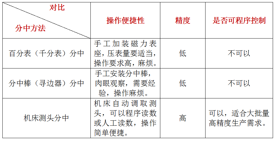 使用百分表(千分表)分中全部需要人工操作,对人员要求很高,操作时间长,且存在人为误差,该方法已经逐步被淘汰,主要是一些个体户或者精度要求不高的加工厂使用。