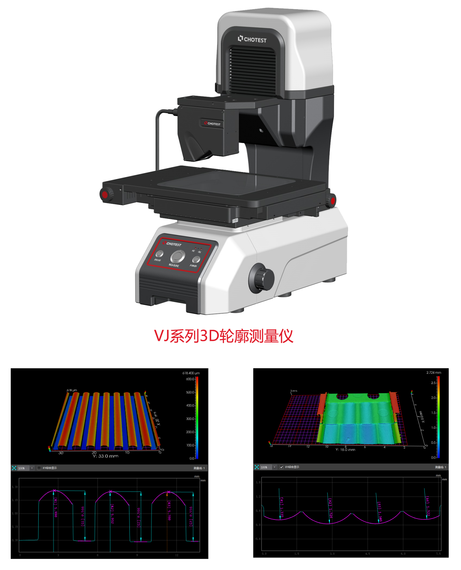 VJ系列3D轮廓测量仪采用高精度线激光测头,无接触高精度3D扫描成像,快速测量线、2点高度、台阶距离、线角度、圆弧直径、高度差、平面度、面角度、 球半径、圆柱半径等2D、3D轮廓尺寸。