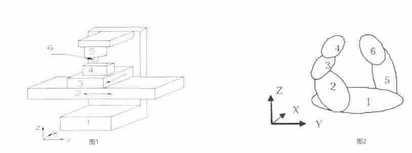 按认可的观点,误差建模是三轴数控铣床误差测量、误差补偿的关键。根据多体系统运动学理论和拓扑结构理论, 把三轴立式数控铣床结构建立结构示意图(如图1所示)和抽象的拓扑结构图(如图2所示),可以以立柱、床身(固 定轴1)为基础建立2个分支和3个运动轴,两个分支终端是工件4和刀具6。