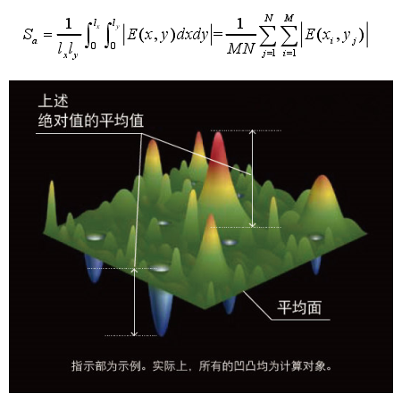 Sa为表面算术平均高度,指轮廓表面内的点与中心面距离的算术平均或几何平均值,在取样区域D上,被测量的轮廓面和建立的基准面之间的z坐标距离的算术平均,即表面粗糙度曲面方程z坐标绝对值的算术平均,数学表达式如下。