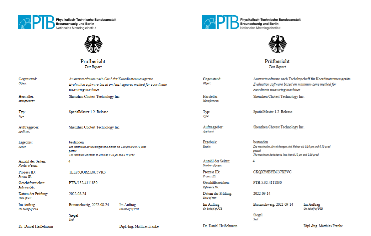 PTB认证结果表明SpatialMaster软件的两种分析算法的精度达到PTB可认证的最高标准: