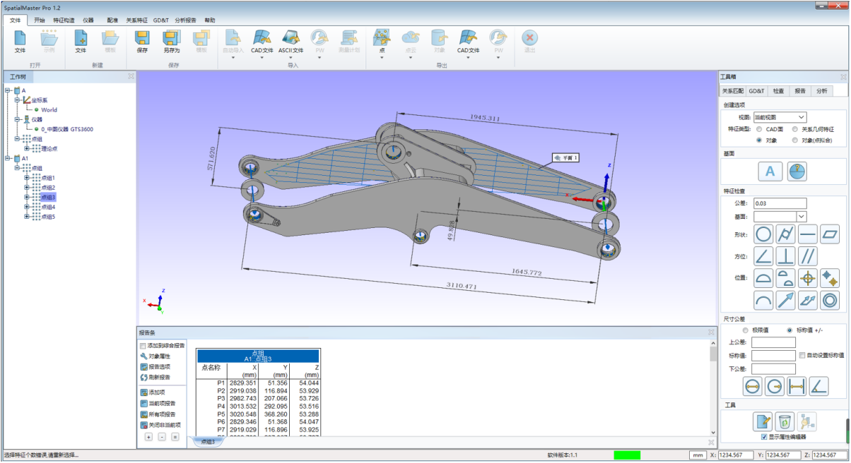 在测量现场,先将GTS激光跟踪仪架设在动臂周边合适位置,将动臂数模导入测量软件,在数模上选取一个平面及两组圆柱,用靶球在实物上采集若干点拟合出对应的平面及圆柱特征,将实物与模型坐标系对齐,继续测量其他特征即可对比实物与模型的差异。