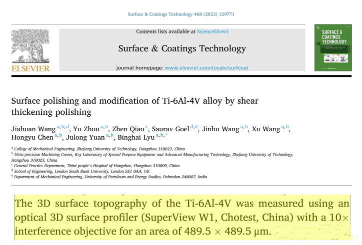 浙江工业大学赵军、吕冰海团队对磨料旋转射流抛光(ARJP)技术,剪切增稠抛光技术等开展深入研究,并利用SuperView W1系列光学3D表面轮廓仪对抛光后表面粗糙度进行检测验证,多篇论文在国际TOP期刊发布。