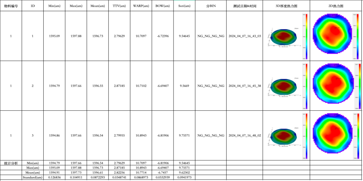 光谱共焦技术测量Wafer Thickness 、TTV 、LTV 、BOW 、WARP 、TIR 、SORI 等参数,同时生成Mapping图;