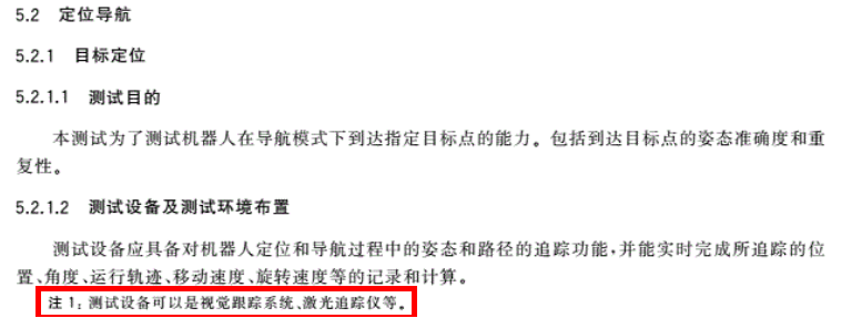 在国家标准GB/T38124《服务机器人性能测试方法》中,对服务机器人的定位导航性能检测项目定义时,明确提出“测试设备可以是视觉跟踪系统、激光追踪仪等。”