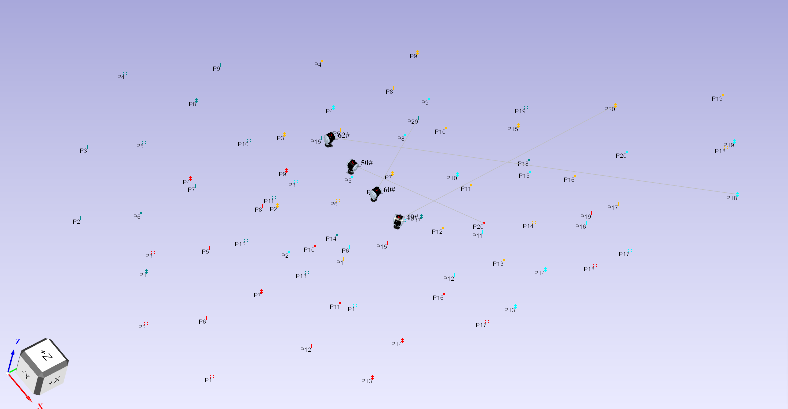 根据测量空间的特点,选择4台GTS3300型号激光跟踪仪,采用分布四角高度不同的布局,确保每个站位跟踪仪将合理范围内且视线无干涉的点位全部采集,后考虑误差分析再进行权重取舍。在长15米宽7米的测量空间范围内,布置20个定位点。跟踪仪和定位点布置见图5。
