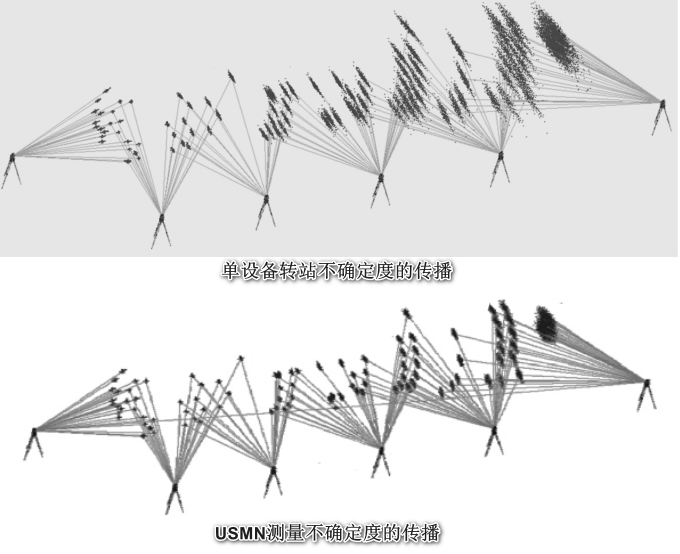 在USMN 测量中,固定目标点的赋值是由该点的所有测站所决定,每个坐标点的不确定度会根据参与测量的各测站的不确定度得到均化,不确定度的传播远小于转站测量,见图2。
