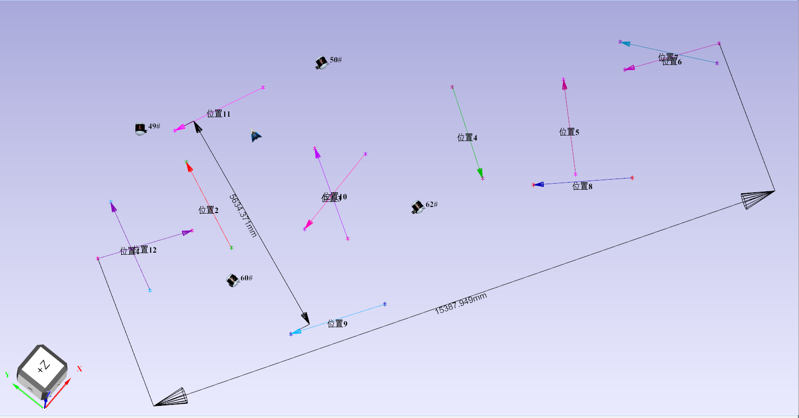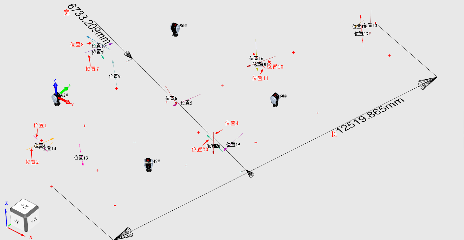 标准杆三坐标测量精度为2299.7103mm。使用2m标准杆,横、斜向不同姿态摆放,在空间范围内进行测量,共计12个位置,每个位置重复3次,摆放位置见图12。