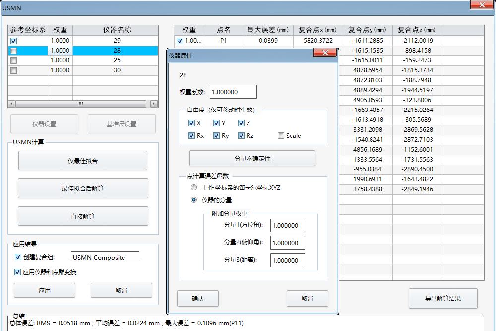 同时可以利用USMN 的数据统计功能(图4)帮助测量分析者判断结果的可靠性,在多站位拟合时,也可及时发现某一站位的测量点中粗大误差,及时剔除防止干扰后续测量的准确性。