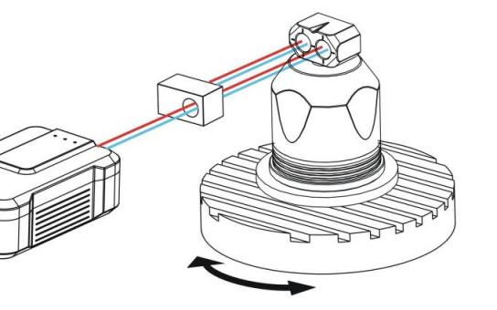 将WR50自动精密转台固定在马达轴心,其顶部反射镜可相对基座反向旋转,反射镜始终与激光束角度锁定在0.5度内,转台每旋转5°,反射镜即反向旋转5°,此时软件将WR50的精密圆光栅角度值和SJ6000的角度值进行合并计算,得出马达实际转动的角度。