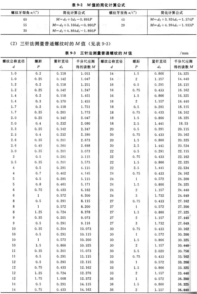 是一种间接测量螺纹中径的方法。测量时,将三根精度很高、直径相同的量针放在被测螺纹的牙凹中,用测量外尺寸的计量器具如千分尺、机械比较仪、光较仪、测长仪等测量出尺寸 。再根据被测螺纹的螺距 、牙形半角和量针直径 ,计算出螺纹中径 。如图9—1所示,测量时,在螺纹凹槽内放置具有相同直径的三根量针,然后,然后用千分尺测量尺寸M的大小,以验证所加工螺纹的中径是否正确。