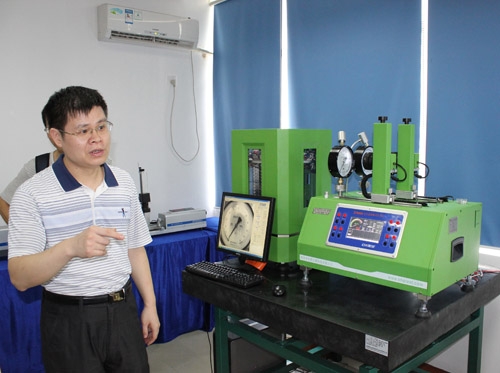 徐主任在观摩全自动活塞压力计演示,并做出重要指导