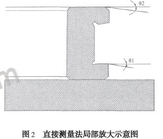 (2)用轮廓仪测量出被测套圈上端面的轮廓,被测套圈得挡边轮廓。然后借助于测量分析软件,计算出被测套圈上端面与水平方向的夹角θ1,被测套圈挡边与水平方的夹角θ2。由θ1和θ2的几何关系可以得出被测挡边的负背角θ3为: