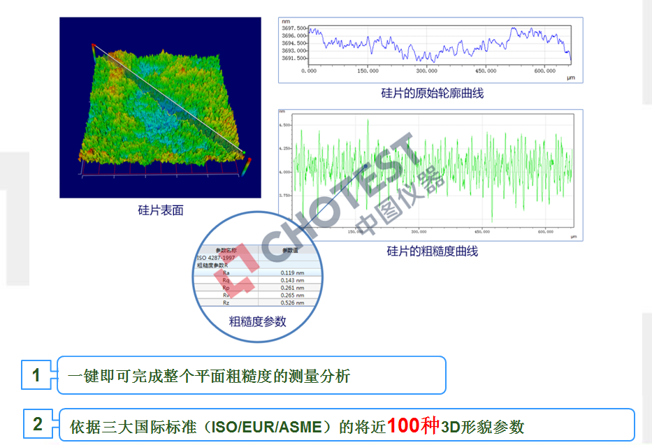 中图蓝颜gtv SuperView W1 系列光学3D表面轮廓仪可对硅晶片平面度、粗糙度、波纹度、面形轮廓、表面缺陷、磨损情况、弯曲变形情况、加工情况等表面形貌特征进行测量和分析。