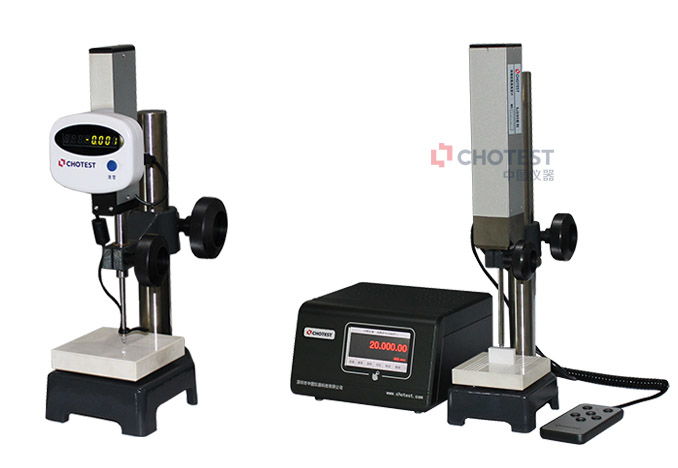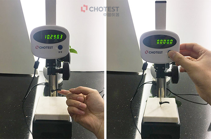 此时用手指轻抬高度计测杆旁边的提扣,观察数显装置屏幕上的数字是否有变化(数值增大或负值增大为正常),然后将提扣轻放至测杆轻触高度计的陶瓷底座平面上,点按数显装置上的“清零”按钮,将高度计启动后的初始状态归零。